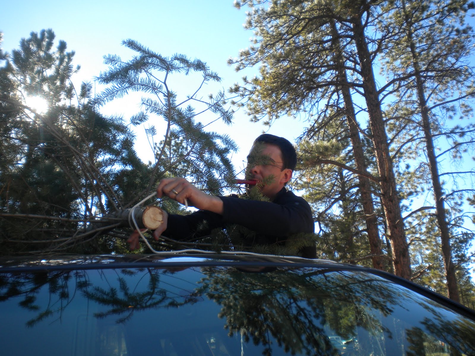 Thank goodness we brought our trusty Boy Scout along to secure our tree to the roof of the car. Since the tree only has eleven branches, we couldn't afford losing any of them on the drive home.